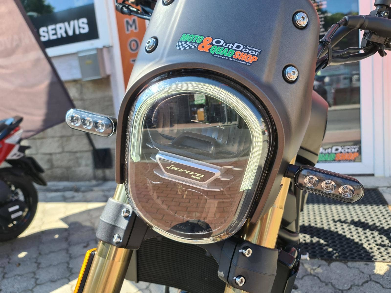 Přední světlomet, je zároveň důležitým desingovým prvkem, který slučuje všechny aktuální modely Benelli Leoncino /125,250,500,800ccm /, je u Benelli Leoncino 800 plně LED s autentickým a sofistikovaným designem, zvýrazněným obloukem a logem Benelli Leoncino uprostřed.